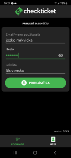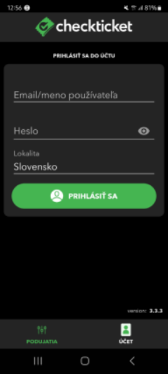 V prípade, že používateľ je organizátor podujatí, na úvodnej obrazovke aplikácie sa vie prihlásiť priamo do aplikácie. Prihlasovacie údaje sú rovnaké ako tie, pomocou ktorých sa organizátor prihlasuje do systému Ticketportal (tzv. viewer prístup/účet).