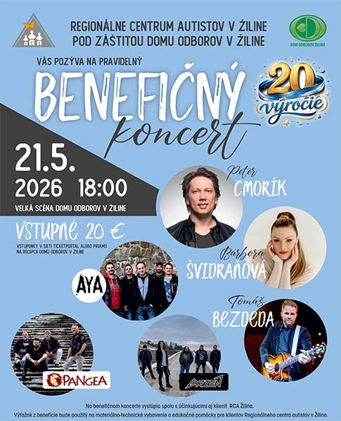 Koncert sa uskutoční vo štvrtok 21.mája 2026o 18:00 hod. v Dome Odborov v Žiline – Veľká scéna.