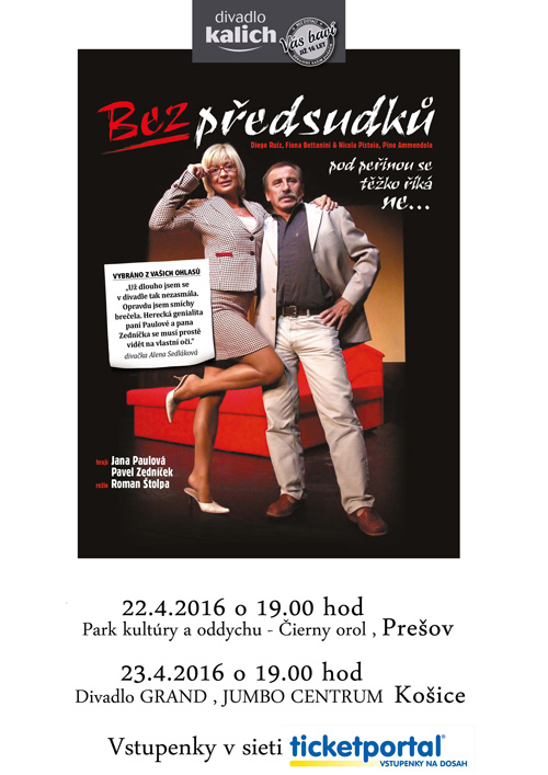 V českej komédii Bez předsudků Vám opäť predstavíme popredných českých komikov Janu Paulovú a Pavla Zedníčka. Diego a Fiona, dvaja dlhoroční priatelia, musia neplánovane prespať v moteli a to spolu v jedinej voľnej izbe. Táto dlhá noc im ponúkne možnosť otvorene sa porozprávať o veciach, na ktoré sa ženy inak hanbia spýtať mužov a muži žien. “Bez předsudků “ je brilantná komédia o priateľstve, o tajomstvách, o zvedavosti a hlavne, o nás samých - divákoch. Stávame sa svedkami vtipného, vybrúseného, veľmi trefného a miestami aj dojemného slovného súboja oboch postáv. A neboli by to Jana Paulová s Pavlom Zedníčkom, aby k tomu nepridali radu nezabudnuteľných gagov.