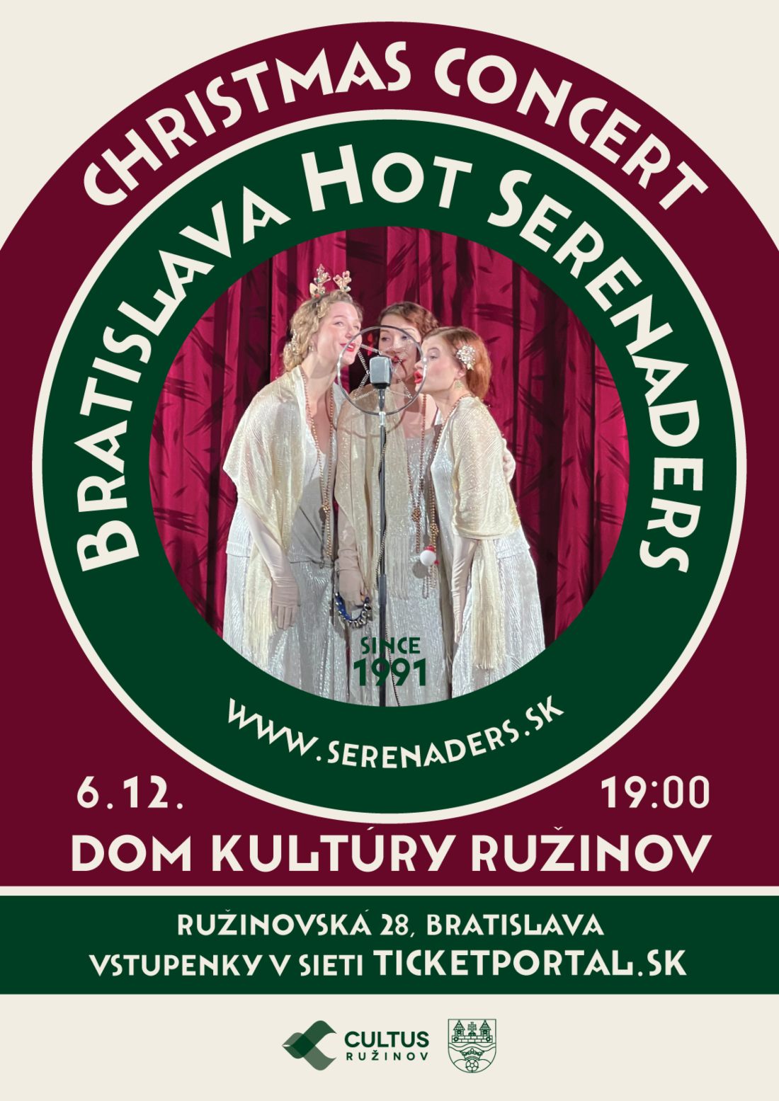 Rok ubehol ako voda, a preto vás srdečne pozývame na pravidelný Vianočný koncert orchestra Bratislava Hot Serenaders. Aby sa tento rok ušli vstupenky všetkým, koncert sa uskutoční vo Veľkej sále Domu kultúry Ružinov. Aj vďaka spolupráci s CUTLUSOM Ružinov s.r.o. sa nám podarilo zachovať nezmenenú výšku vstupného, akú máme na Nivách. Koncert sa uskutoční na Mikuláša, v SOBOTU 6. decembra 2025 so začiatkom o 19:00.