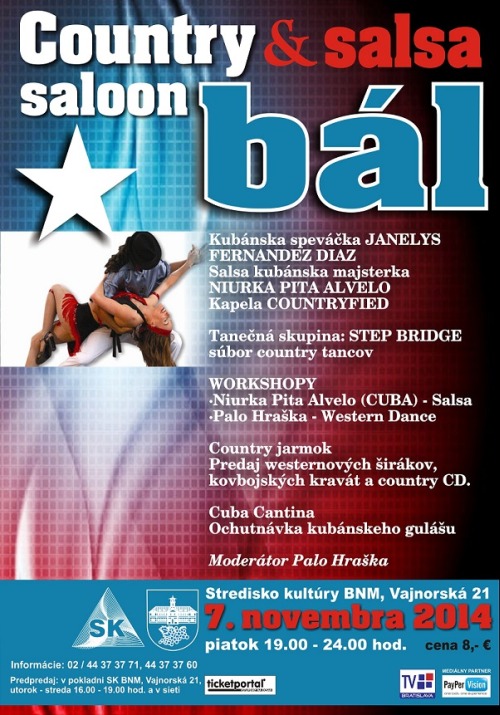 Opäť je tu netradičný Country bál na Vajnorskej - tentoraz v SALSA štýle – a opäť je plný prekvapení. Dobrú country muziku a osvedčené československé evergreeny prinesie kapela COUNTRYFIED. Horúce karibské vetry zadujú tentoraz z Kuby. Čakajú nás privátne tanečné workshopy SALSY! K dispozícii budú aj sadrové dlahy na polámané nohy. Kubánska tanečná majsterka NIURKA PITA ALVELO všetkých zoberie do „parády“ a naučí nás originálne kubánske salsa kroky a tanečné variácie pre úplných začiatočníkov, ale aj pokročilejších „Salsanov“ - mimozemšťanov z planéty Salsa. Podľa renomovaných UFO-lógov chystajú sa početné nájazdy Salsanov aj z blízkych vesmírnych staníc (špióni už nabonzovali Senec). Dúfam, že neostanú namäkko všetkými aj vlastnými vetrami ošľahaní bratislavskí kovboji!
