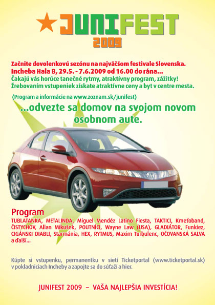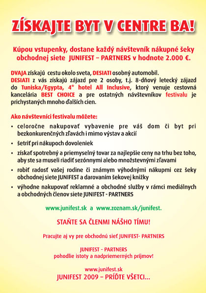 OD 1.6.2009 platí JEDEN lístok na JUNIFEST pre 2 OSOBY! Zoberte na festival svojich známych a bavte sa v príjemnom prostredí a pri výbornej hudbe. 2 návštevníci festivalu na JEDEN lístok !
