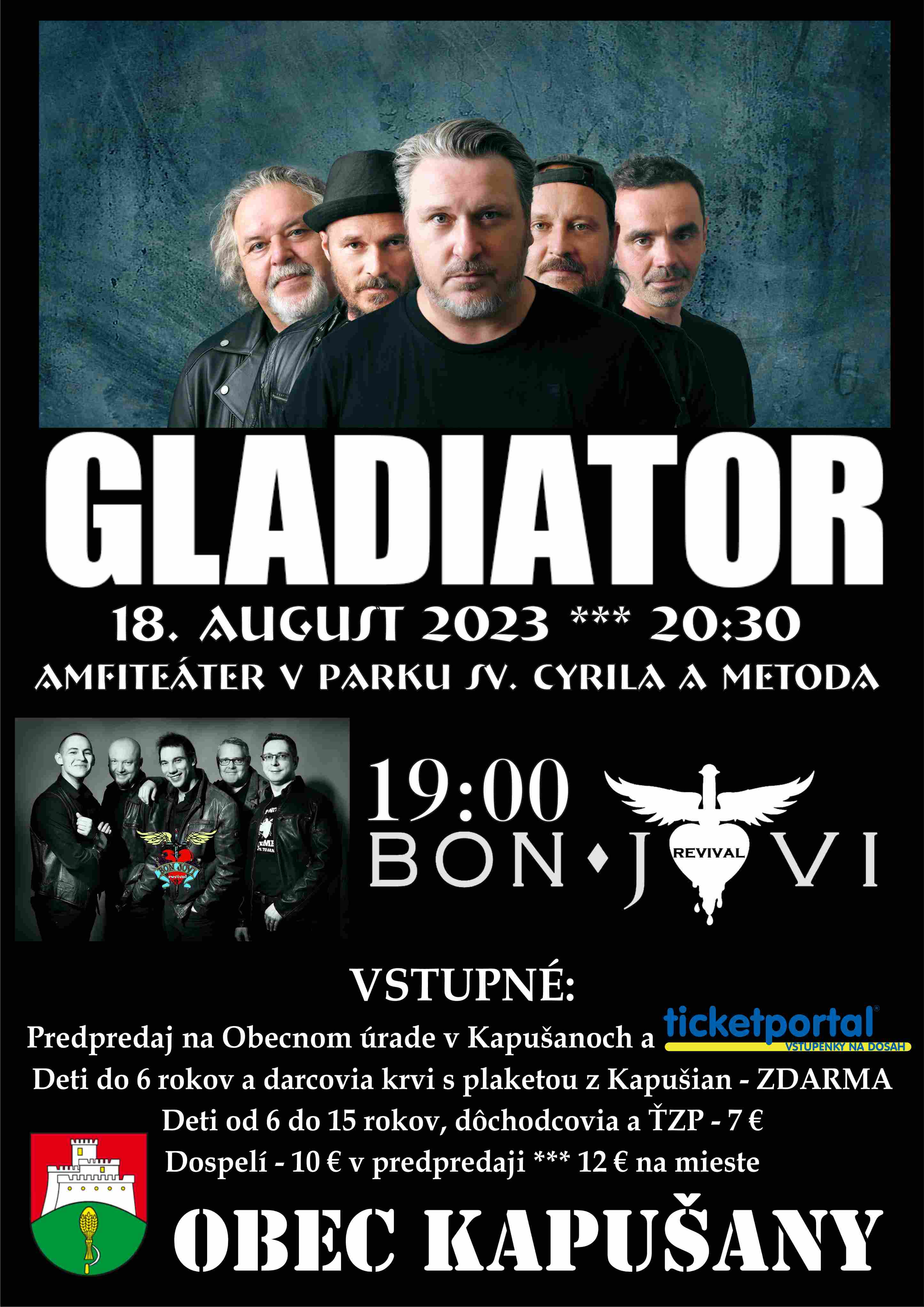 Koncert hudobnej skupiny GLADIATOR o začiatkom o 20:30 hod. (vystúpenie predskokana BON JOVI REVIVAL o 19:00 hod.)