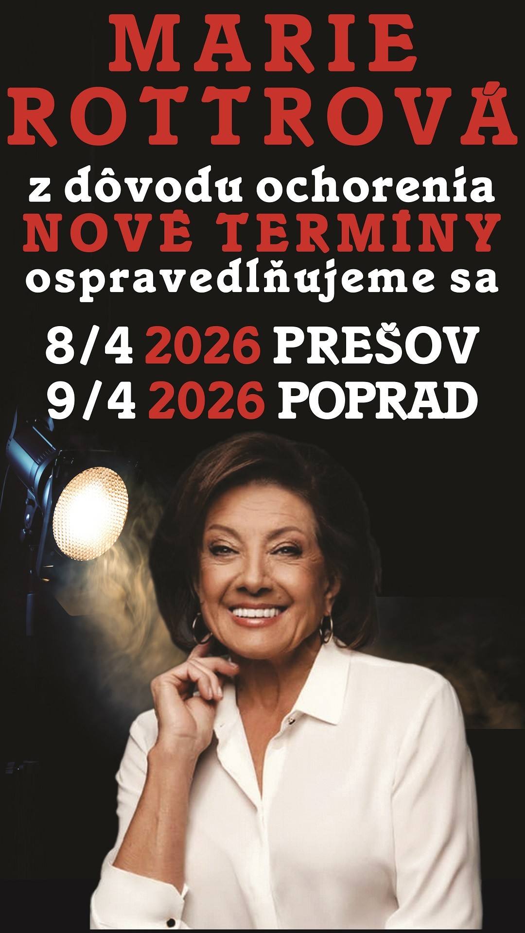 20.02.2026 o 19:00 hod. v Tatran Handball Aréna, Prešov, je z dôvodu ochorenia pani speváčky Marie Rottrovej ZMENENÉ! Predstavenie sa uskutoční v novom termíne: 08.04.2026 o 19:00 hod. v pôvodnom mieste konania.