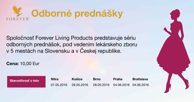 Spoločnosť Forever Living Products predstavuje sériu odborných prednášok, pod vedením lekárskeho zboru v 5 mestách na Slovensku a v Českej republike. V Bratislave, v Nitre, v Košiciach a v Prahe a v Brne. Začiatok prednášok je vždy v sobotu, 10:00, predpokladaný koniec 15:00.