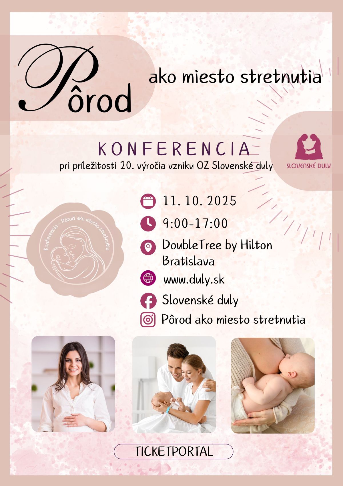 Pri príležitosti 20. výročia založenia OZ Slovenské duly vás srdečne pozývame na konferenciu "Pôrod ako miesto stretnutia". Je určená predovšetkým pre laickú verejnosť, najmä tehotné ženy, ale aj pre tých, ktorí sa o témy súvisiace s raným materstvom zaujímajú. Prinášame Vám jedinečný priestor na diskusiu s odborníkmi a zdieľanie poznatkov zo starostlivosti o ženu počas tehotenstva, pôrodu aj popôrodného obdobia.