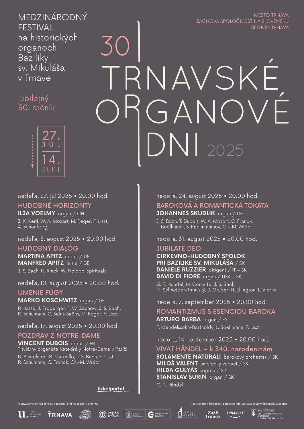 Od 27. júla až do 14. septembra budú v Bazilike sv. Mikuláša v Trnave každú nedeľu znieť koncerty jubilejného 30. ročníka medzinárodného festivalu Trnavské organové dni. V bazilike sa nachádzajú dva vzácne historické organy, malý barokový pozitív Valentina Arnolda z roku 1783 (najstarší organ v Trnave) a veľký romantický organ Rieger z roku 1912, na ktorom hrával Mikuláš Schneider-Trnavský. Už 29. rokov tieto nástroje prezentovali organoví virtuózi z celého sveta. V rokoch 2001 a 2002 Trnavu navštívil napríklad slávny český skladateľ Petr Eben, ktorý na pamiatku trnavských koncert napísal improvizáciu na duchovnú pieseň Matka božia trnavská. Na ôsmich koncertoch sa okrem slovenských interpretov predstavia umelci zo Švajčiarska, Nemecka, Španielska, Francúzska a USA. Na festivale 17. augusta zahrá Francúz Vincent Dubois, ktorý je titulárnym organistom parížskej katedrály Notre Dame a ktorý je považovaný za jedného z najlepších organistov na svete. Jeho dokonalú virtuóznu hru a pôsobivú francúzsku muzikalitu si budú môcť poslucháči nielen vypočuť 17. 8 , ale aj vidieť na obrazovke v lodi chrámu. Na záver festivalu zaznejú nádherné koncerty G. F. Händla pre organ a barokový orchester. Podujatie podporil Fond na podporu umenia, Mesto Trnava, Ministerstvo turizmu a športu a Veľvyslanectvo Španielskeho kráľovstva v Bratislave.