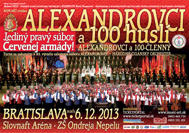 For the first time in history, will perform two such known corps at one stage like "Alexandrovci" and 100-member Gypsy Orchestra. In the first part of the program you can listen to a selection program of 100-member Gypsy Orchestra from Budapest and in the second part gala concert of phenomen named "Alexandrovci" and of course surprise of evening will their common beautiful masterpieces.